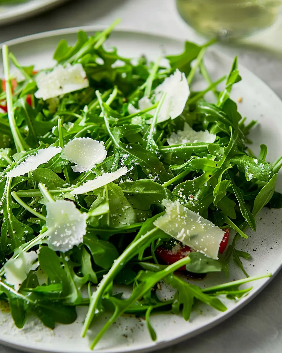 A refreshing arugula salad topped with parmesan, perfect for a light meal or side dish.