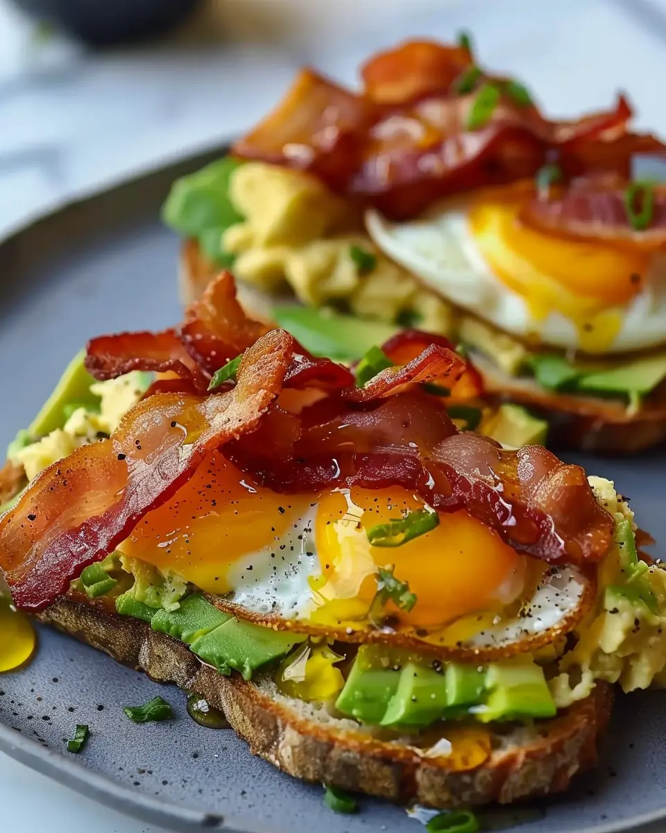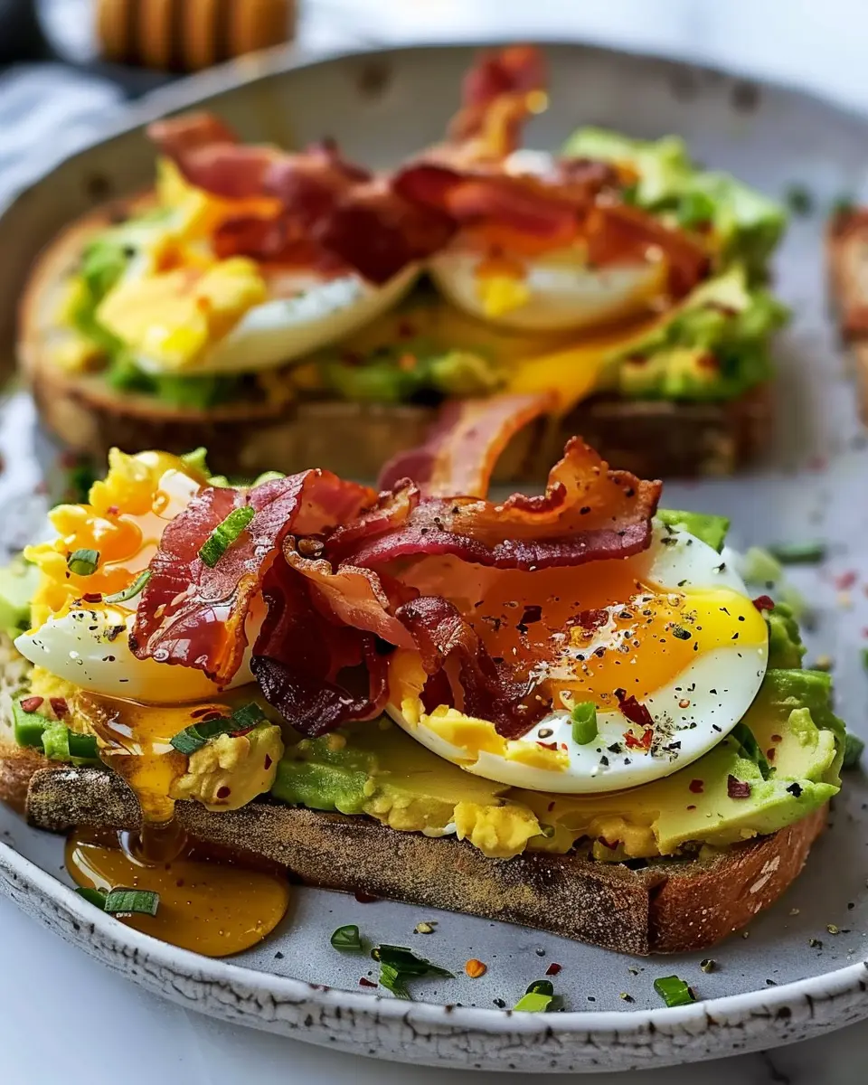 A delicious breakfast recipe featuring creamy avocado, crispy bacon, and perfectly cooked eggs topped with spicy honey.