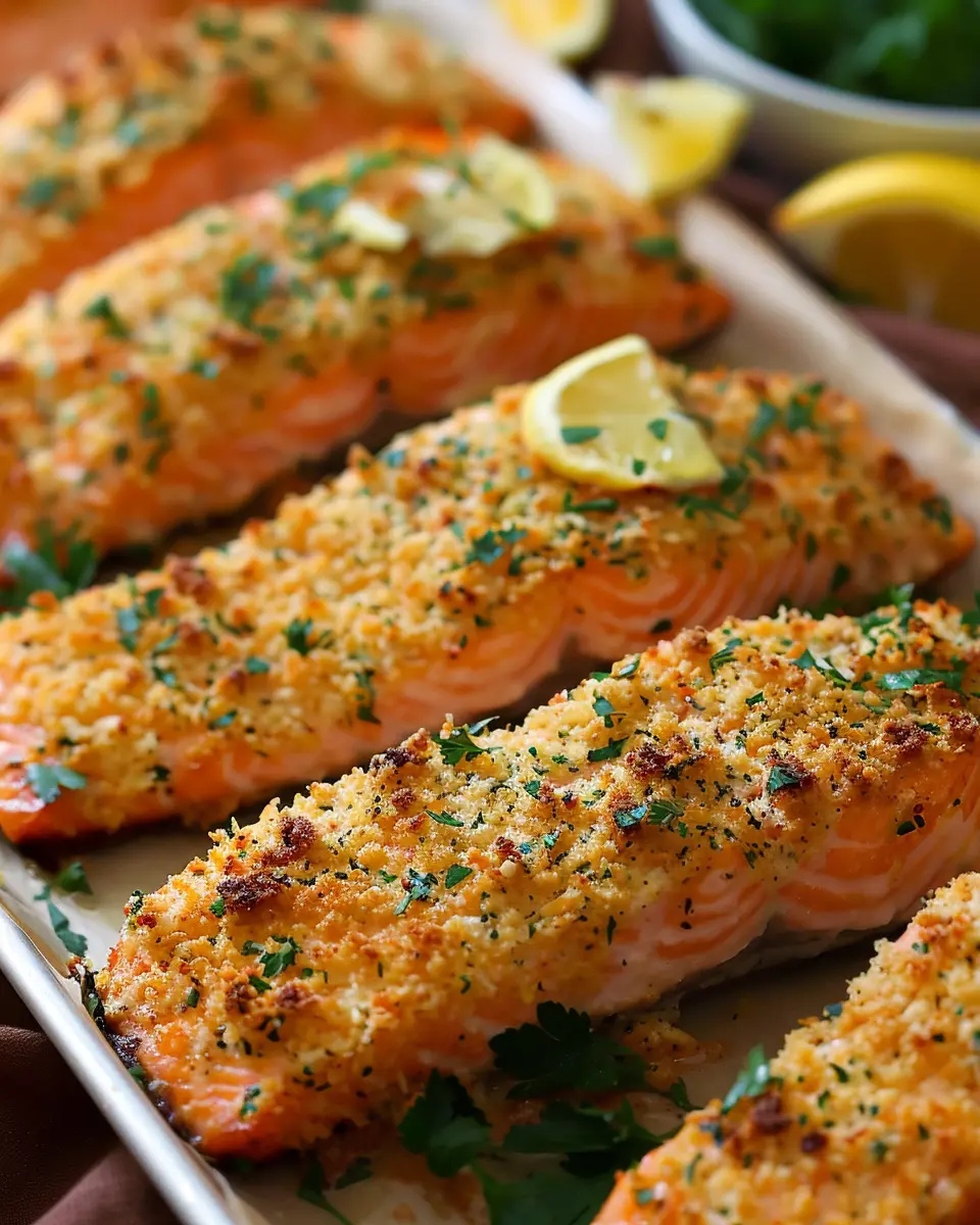 A delicious and easy recipe for baked salmon topped with a crispy parmesan crust, perfect for weeknight dinners.