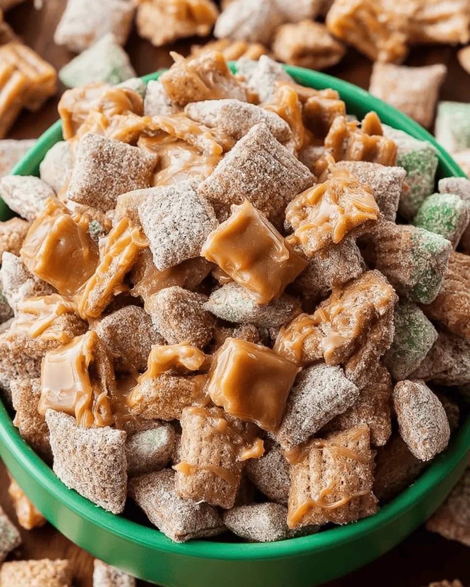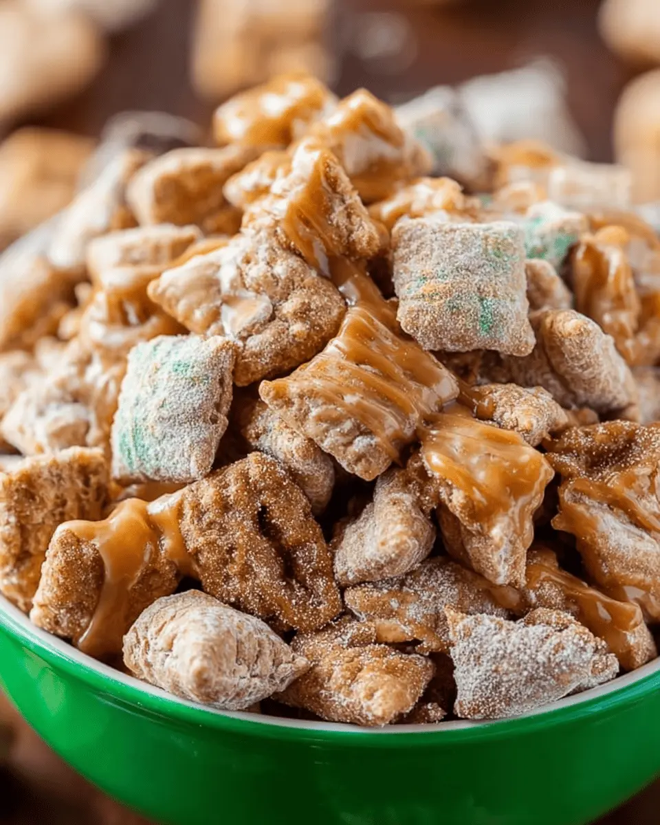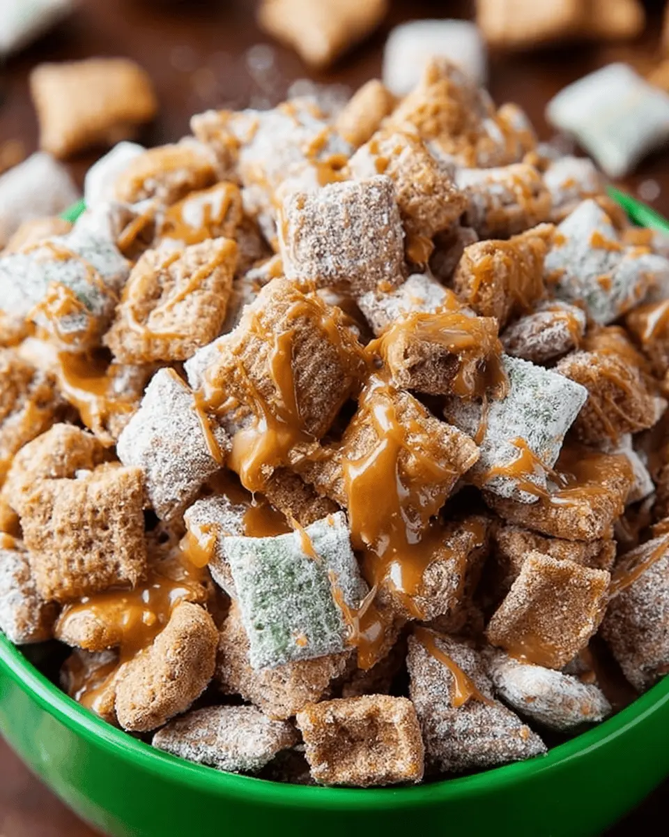 A delightful and indulgent twist on classic puppy chow, merging caramel and apple flavors for a perfect treat.
