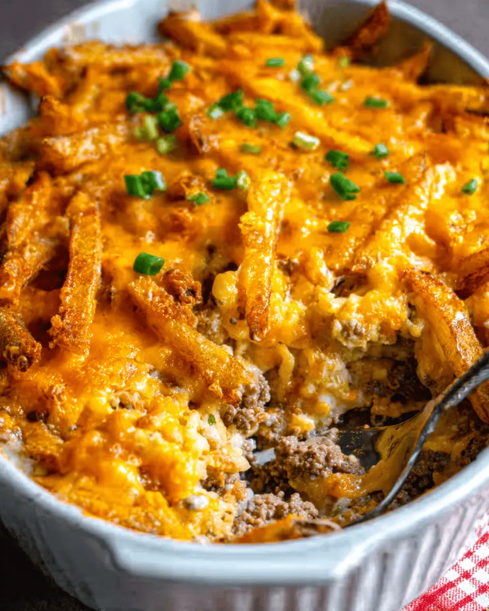 A delicious and easy recipe for cheeseburger french fry casserole that the whole family will love.