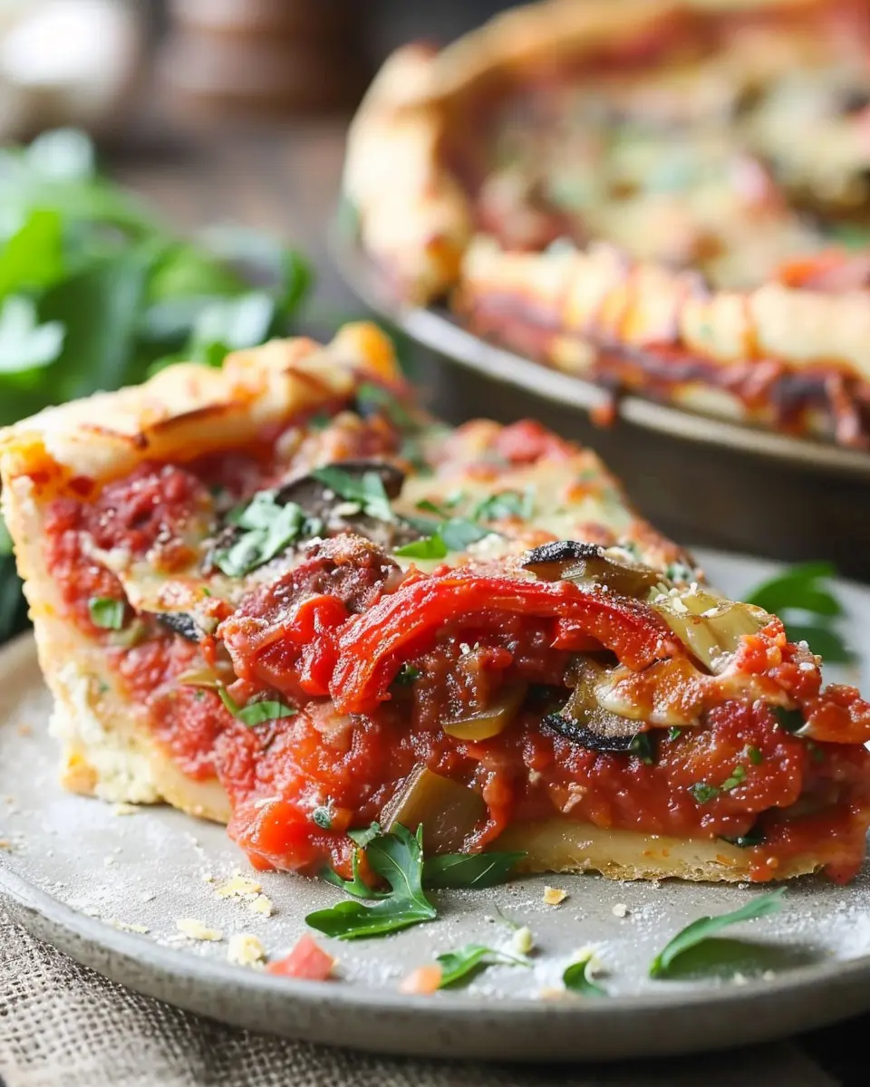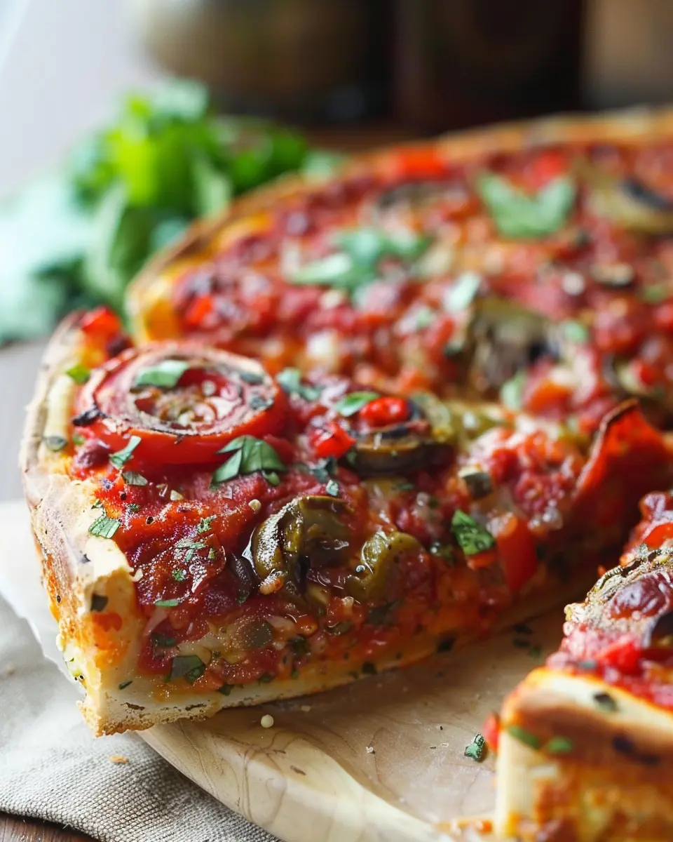 Enjoy the rich flavors of a Chicago deep-dish-style veggie pizza right in your home kitchen with this easy recipe!