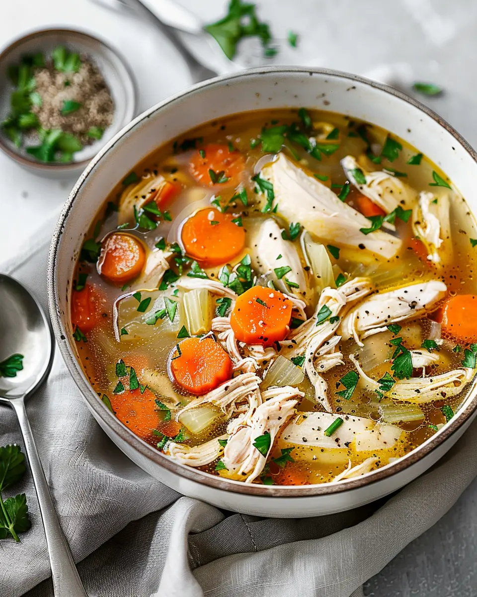 Enjoy a warm bowl of homemade chicken soup that brings comfort and joy on chilly days.