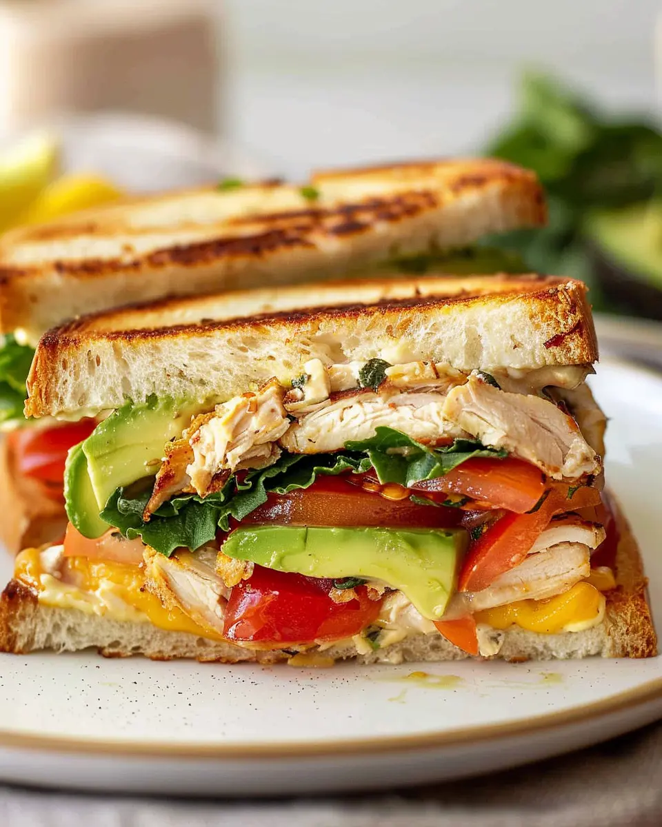 - Assemble the sandwich by spreading the avocado mixture on one side of the sourdough bread, placing the grilled chicken and cheese on top, then covering with another slice of bread.