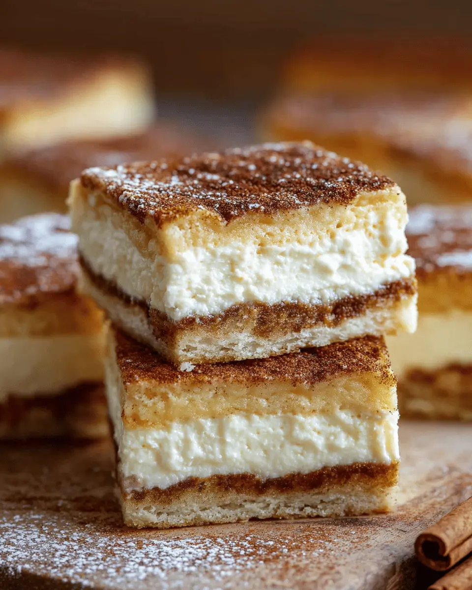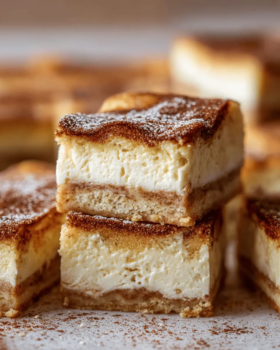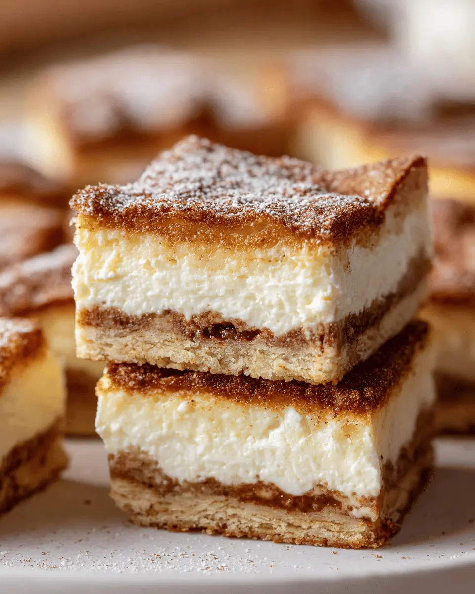 Indulge in a sweet treat with these Churro Cheesecake Bars, featuring a delicious cinnamon sugar topping!