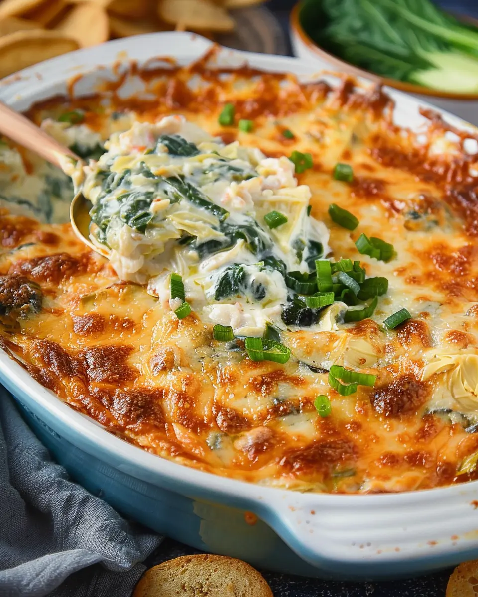A creamy and flavorful dip that combines the richness of crab meat with the freshness of spinach and the tanginess of artichokes, perfect for any gathering.