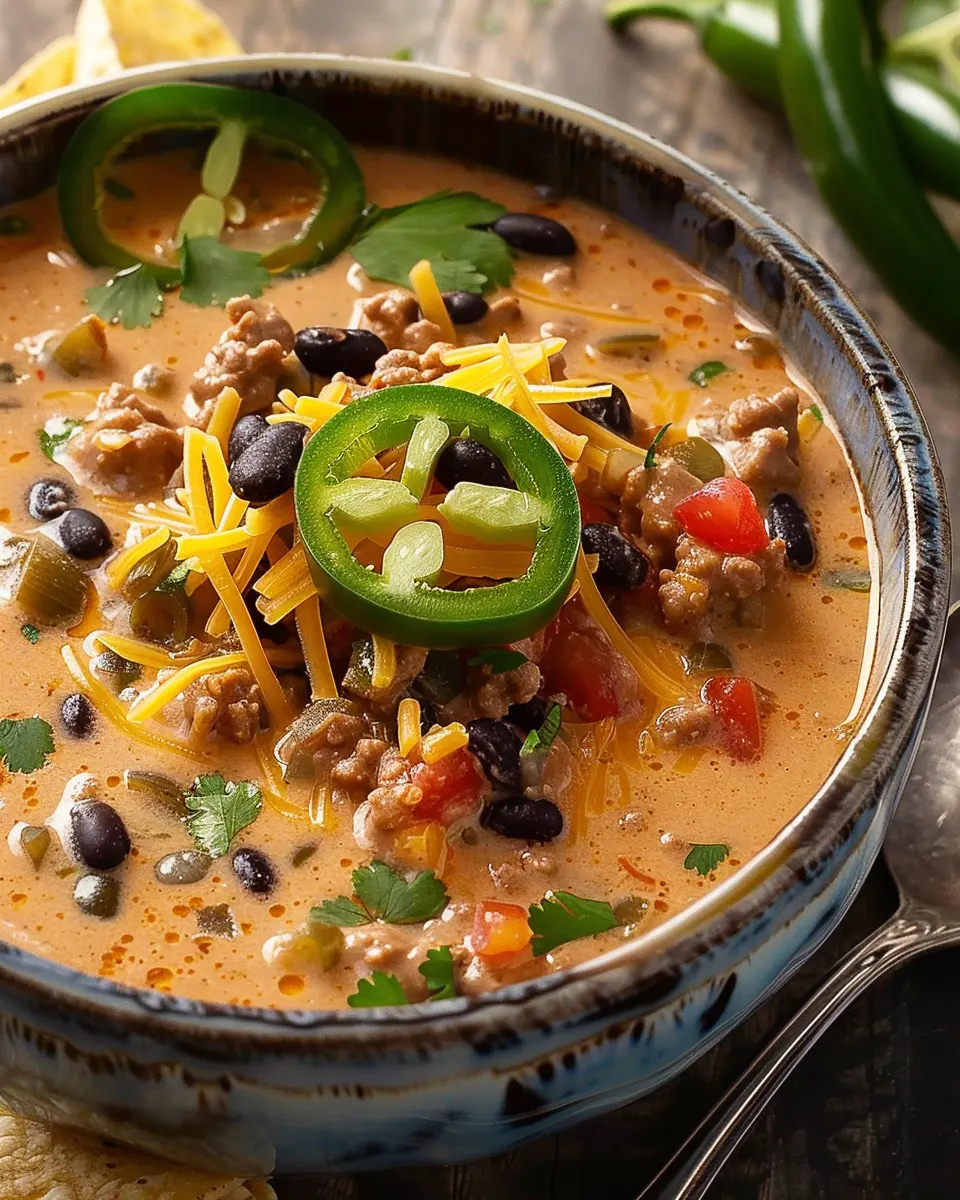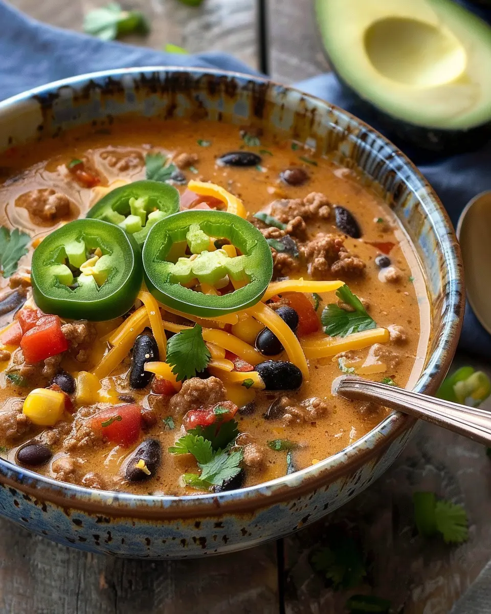 A deliciously easy taco soup combining creamy textures and savory flavors.