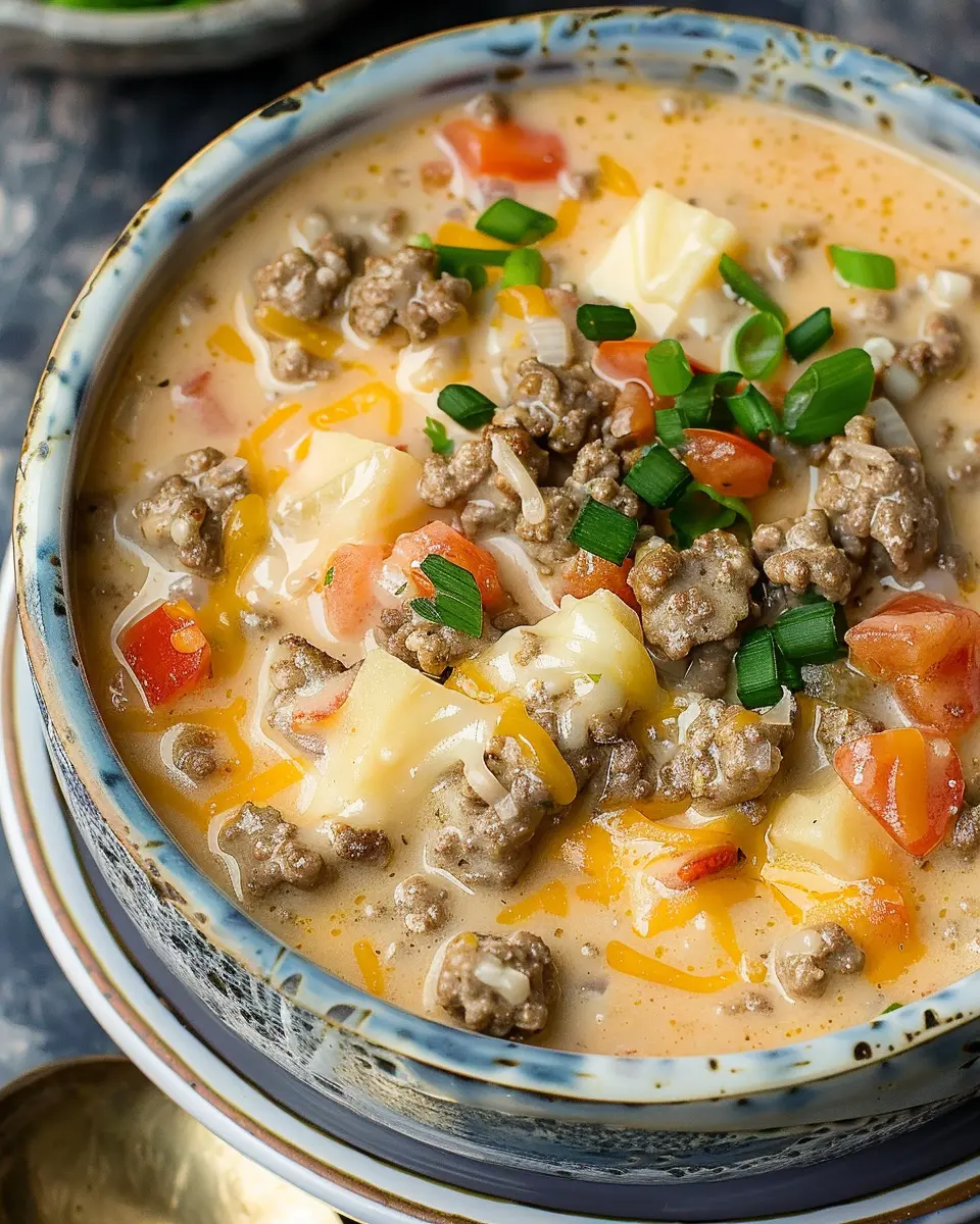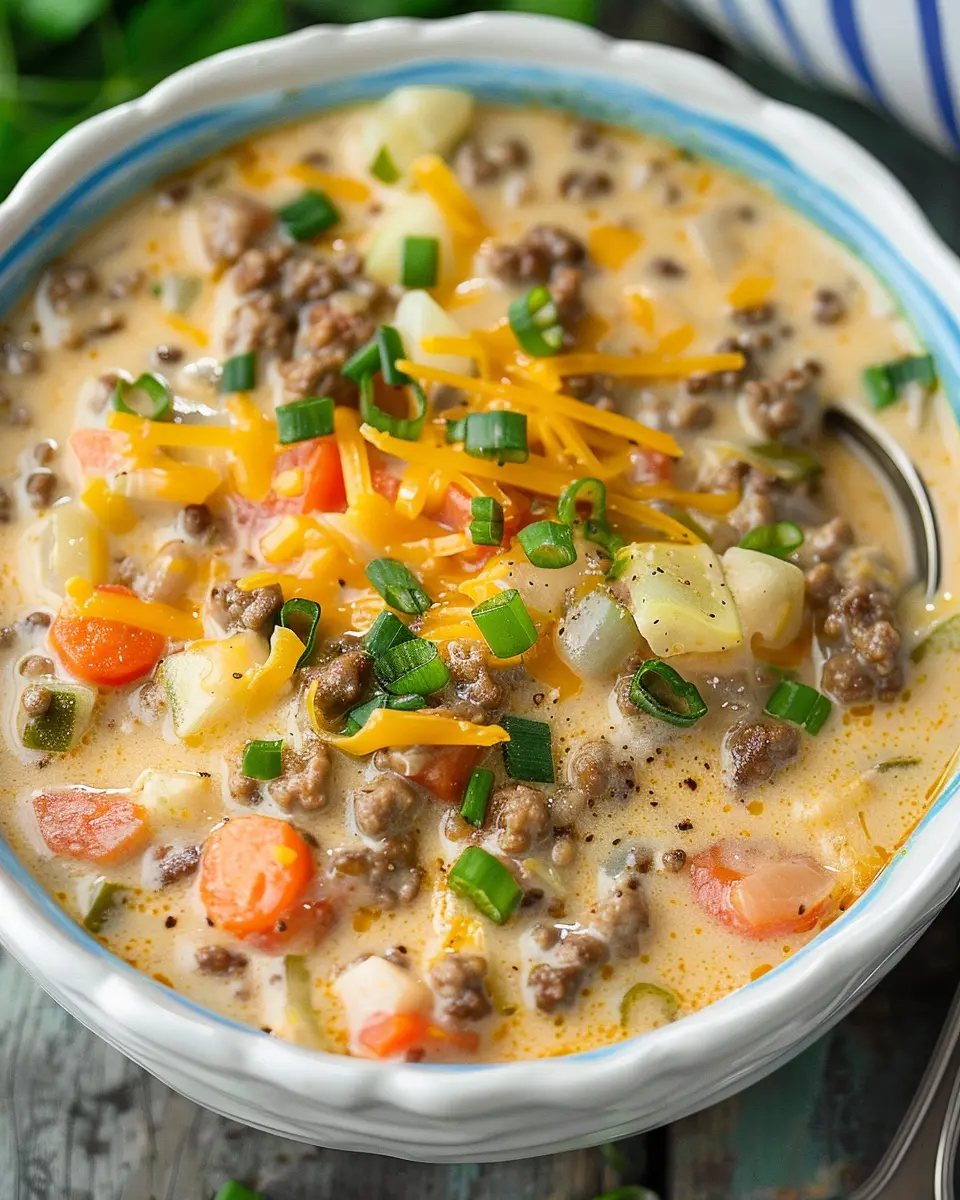 Home » Recipes » Easy Cheeseburger Soup: A Cozy, Indulgent Twist with Turkey Bacon