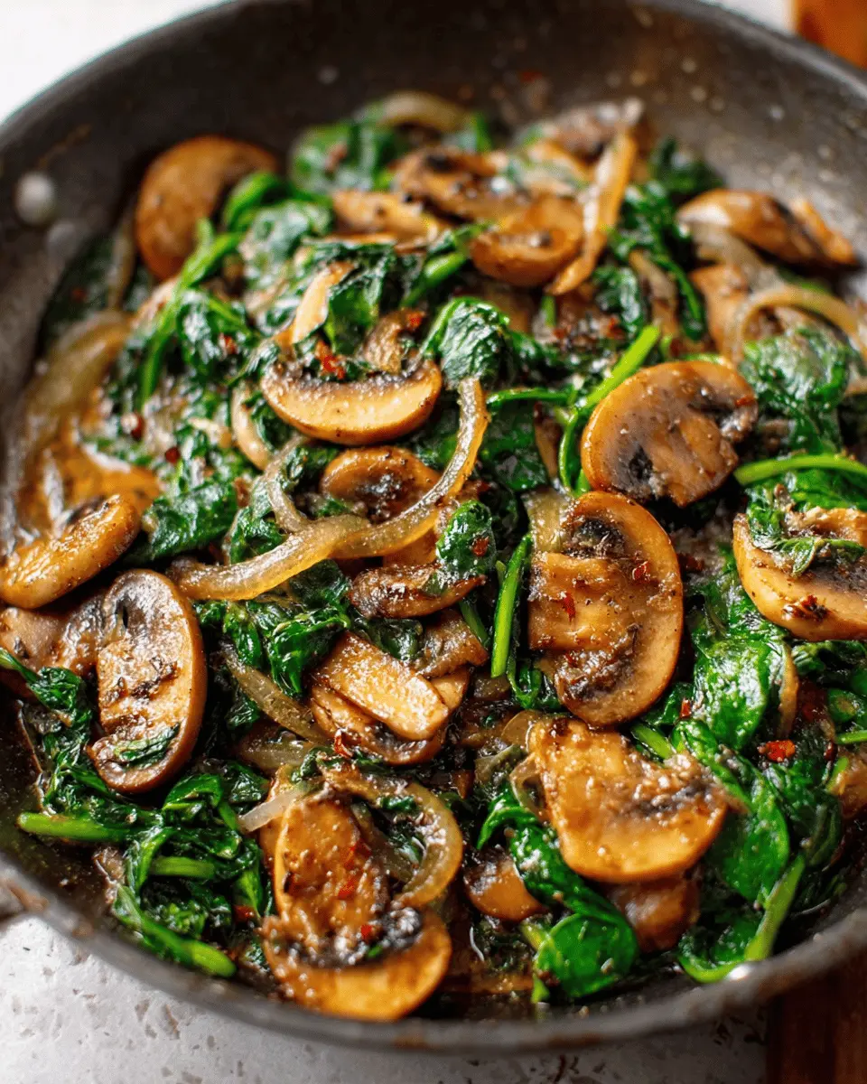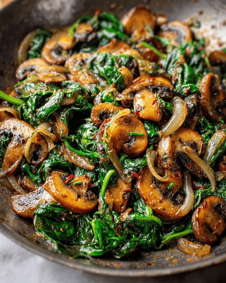 Enjoy this quick and nutritious recipe for sautéed spinach with mushrooms and onions, perfect for a healthy meal side.