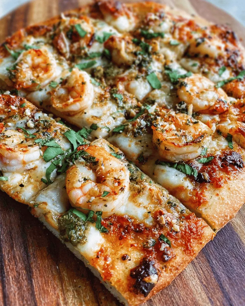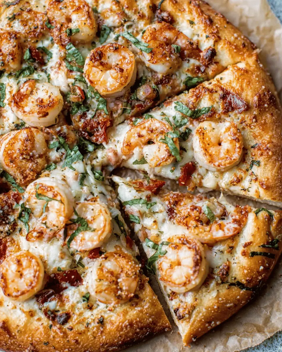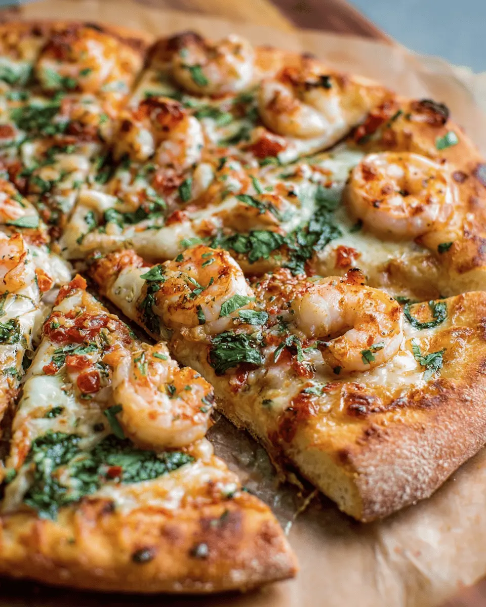 Indulge in the rich flavors of garlic butter shrimp pizza that combines juicy shrimp with melty cheese on a perfectly baked crust.