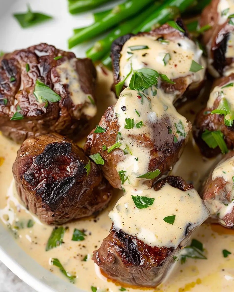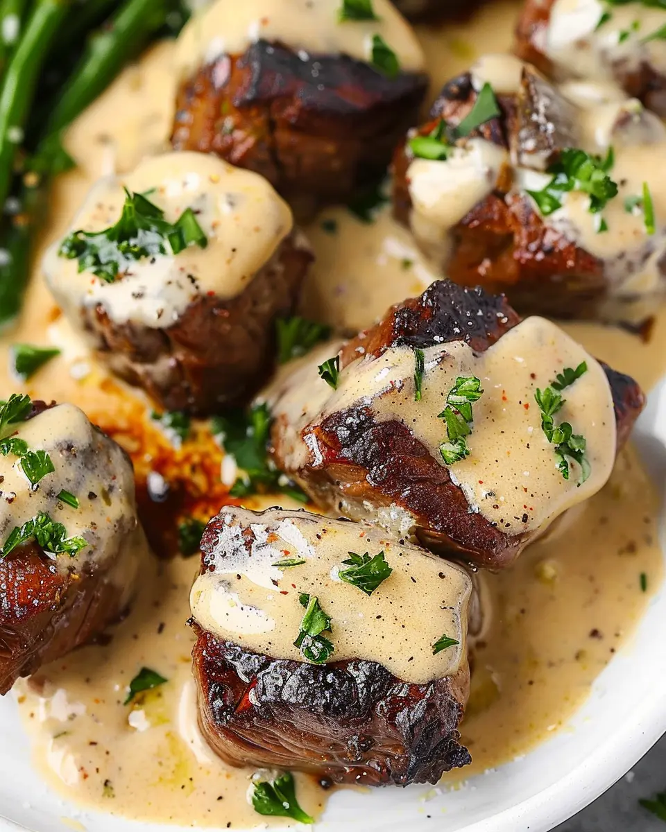 PrintGarlic Butter Steak Bites with Parmesan Cream Sauce: Easy Indulgence