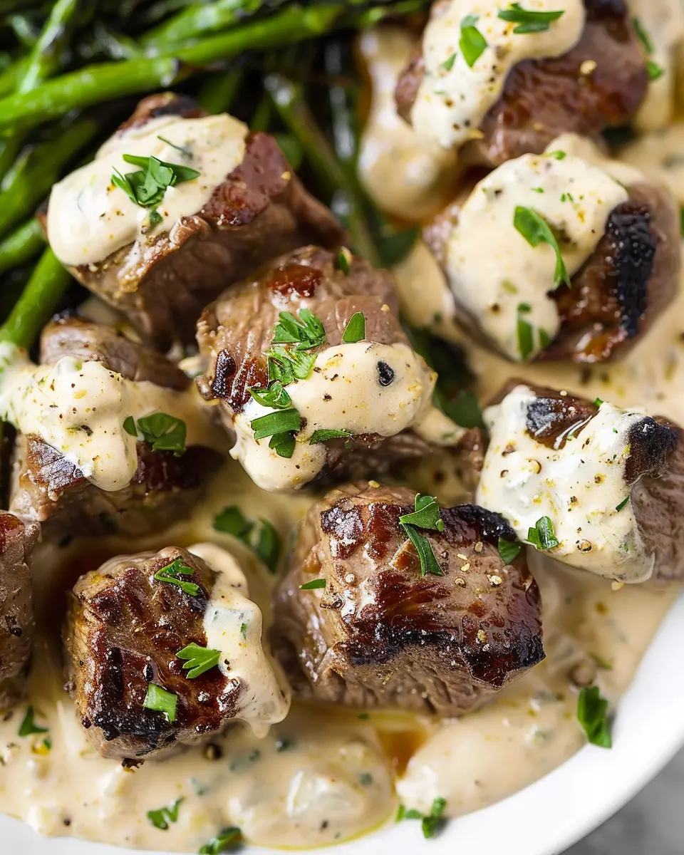 Delicious garlic butter steak bites served with a rich parmesan cream sauce.