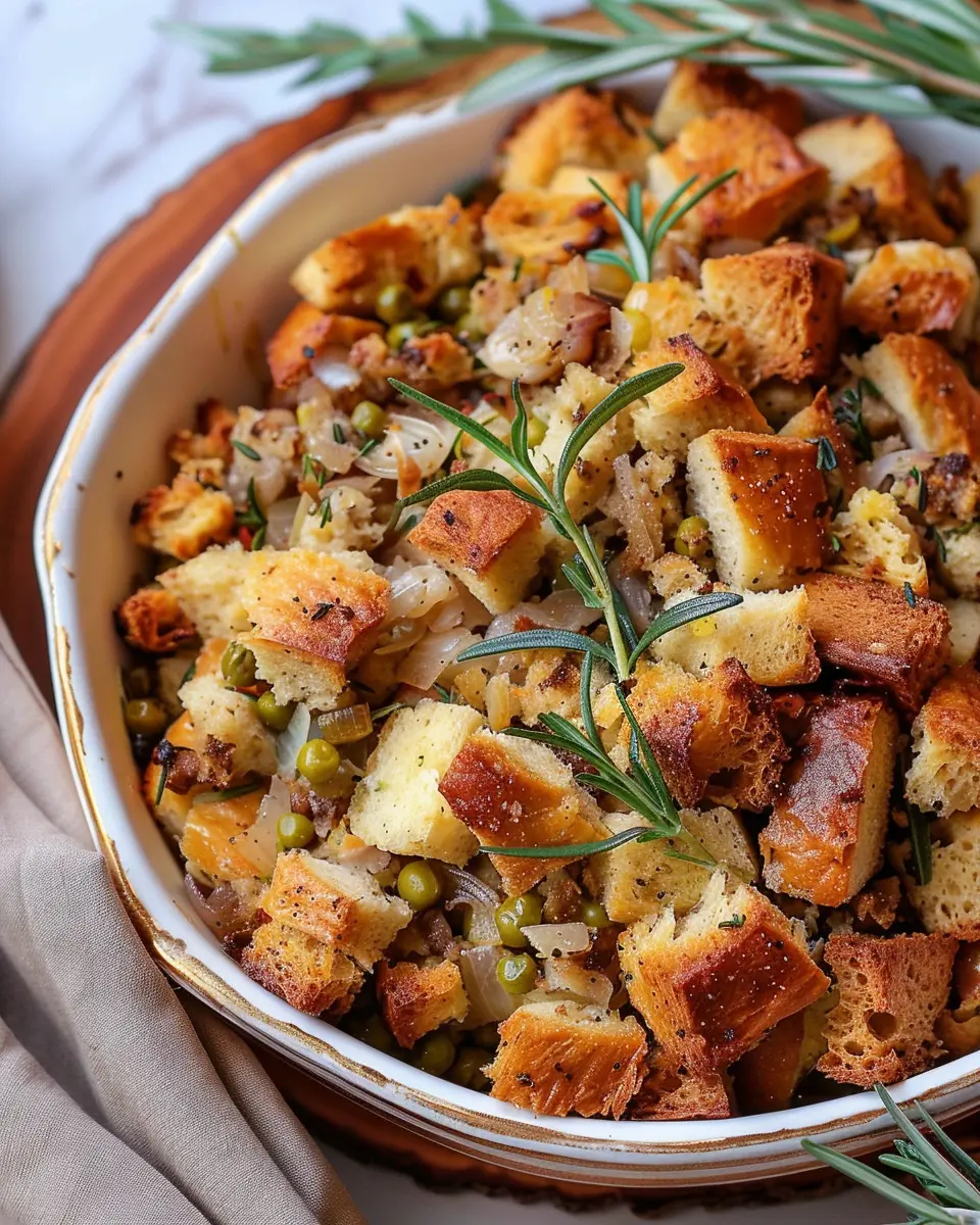 Transfer the stuffing mixture into a greased baking dish. For that nice, crispy topping, spread it out evenly and cover it loosely with aluminum foil. Bake in a preheated oven at 350°F (175°C) for about 30 minutes. Remove the foil and allow it to bake for an additional 15-20 minutes until it’s golden brown and slightly crispy on top.