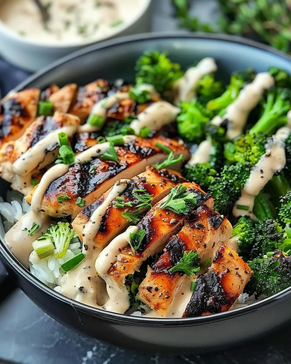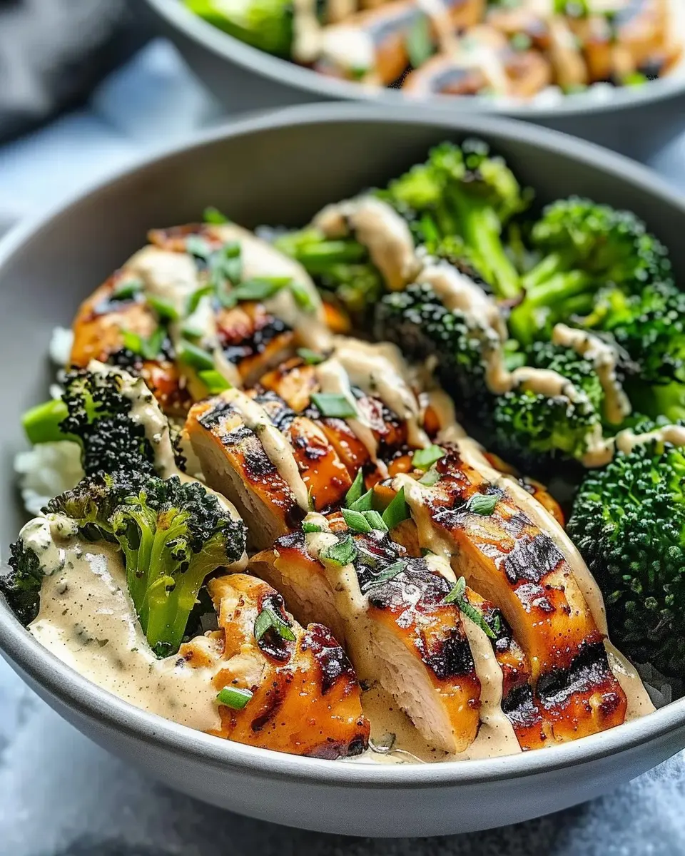 PrintGrilled Chicken Broccoli Bowls with Creamy Garlic Sauce Delight