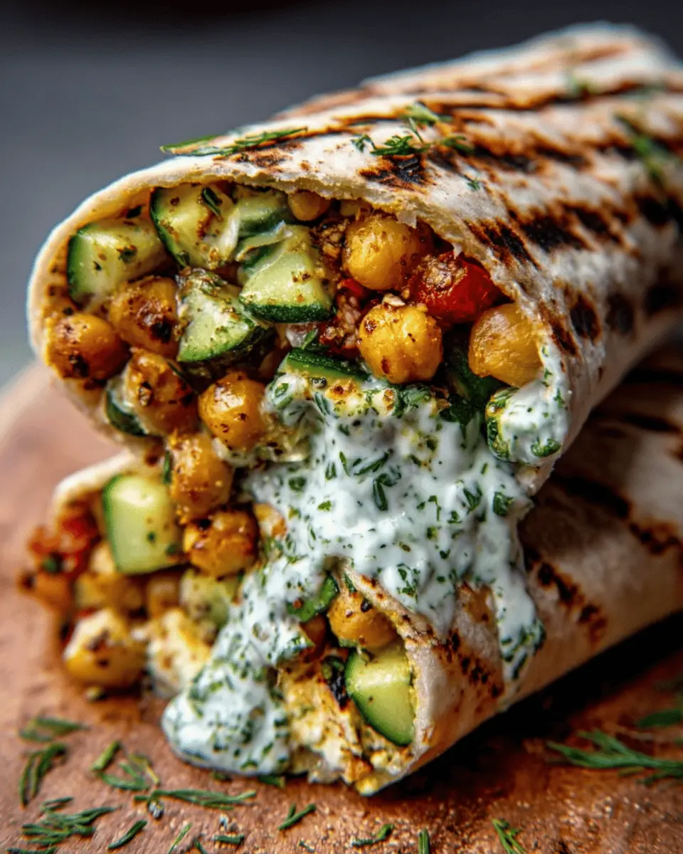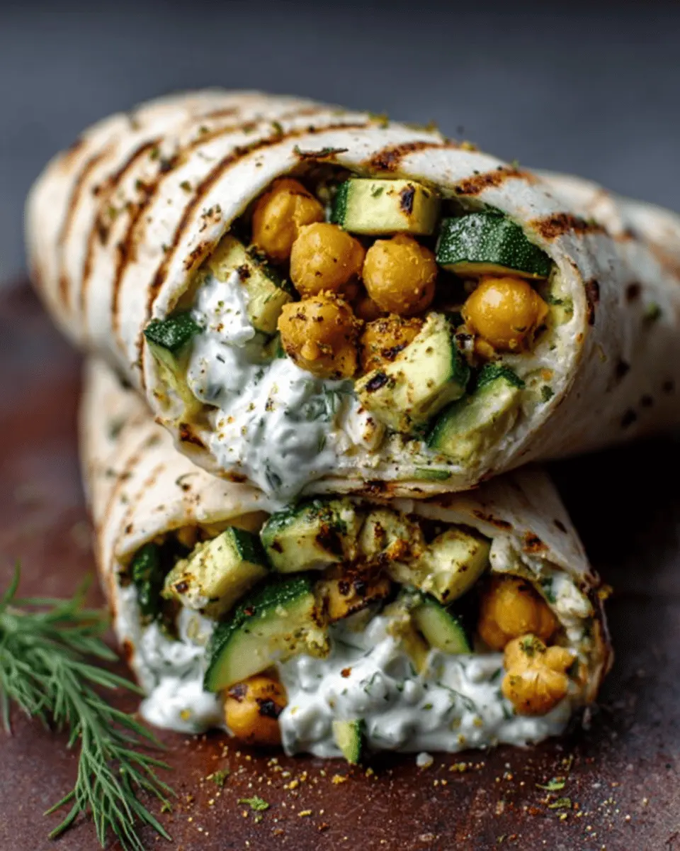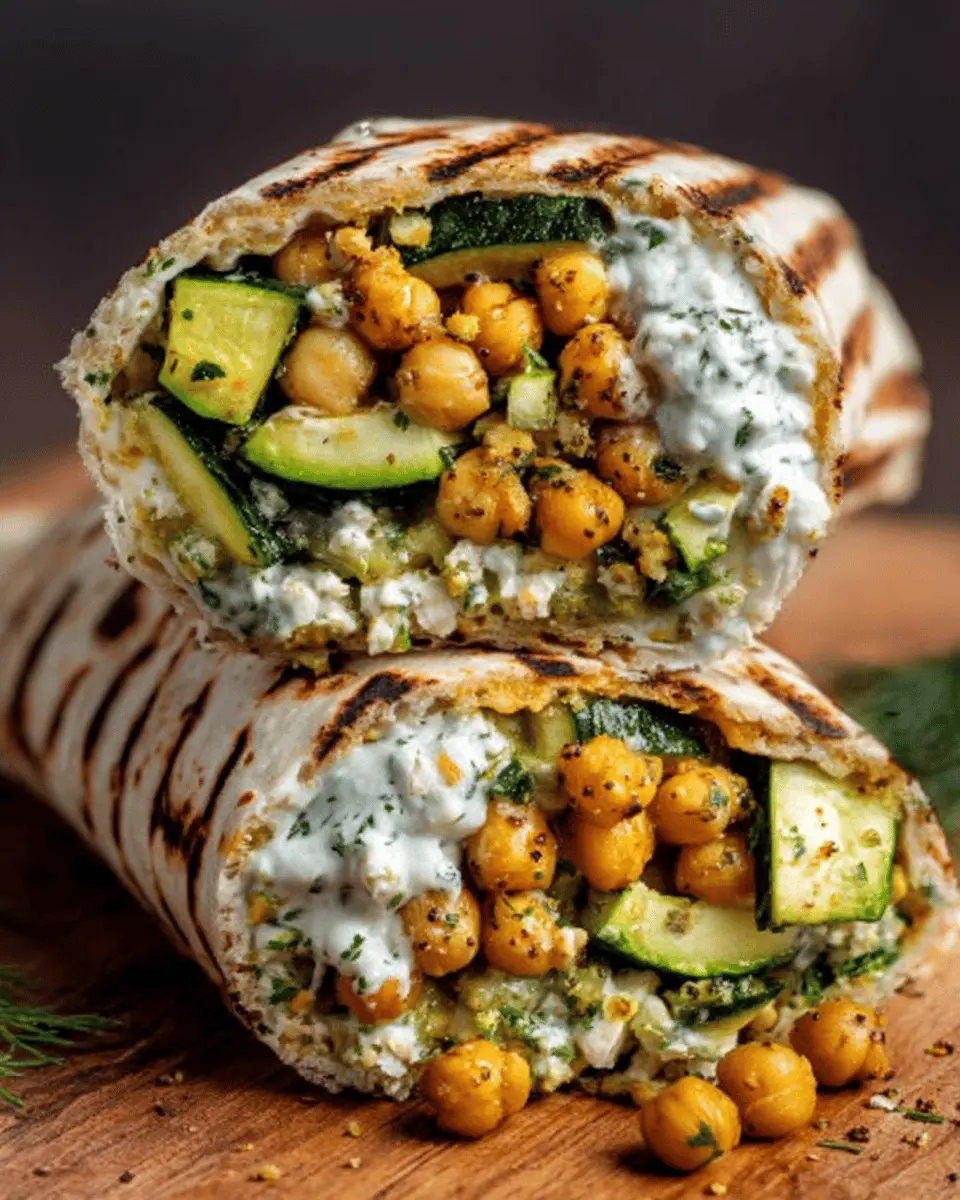 A delicious and healthy wrap featuring grilled zucchini, feta cheese, and chickpeas, topped with a herbed yogurt sauce.
