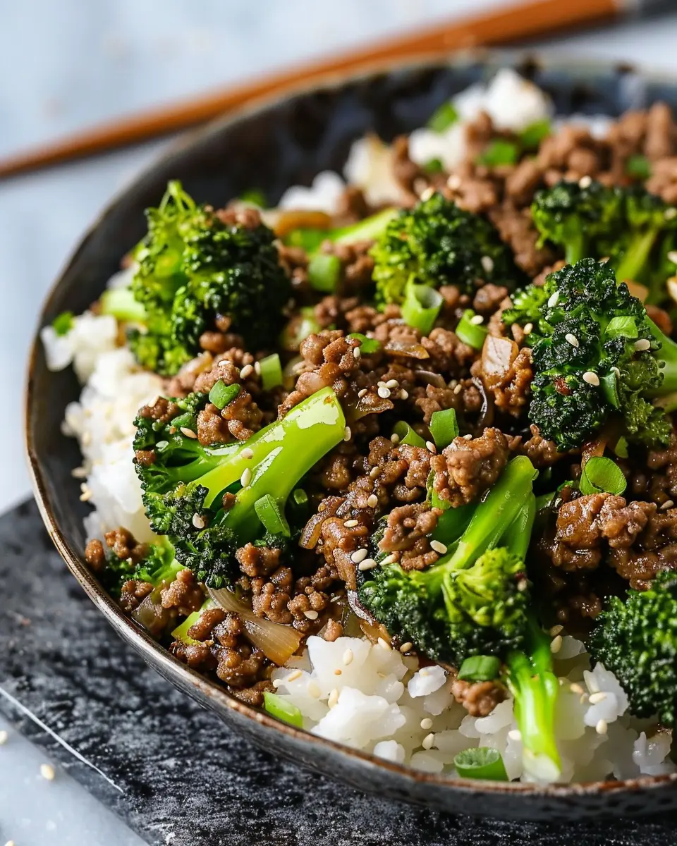 A quick and delicious stir fry that combines ground beef and fresh broccoli, perfect for any weeknight dinner.