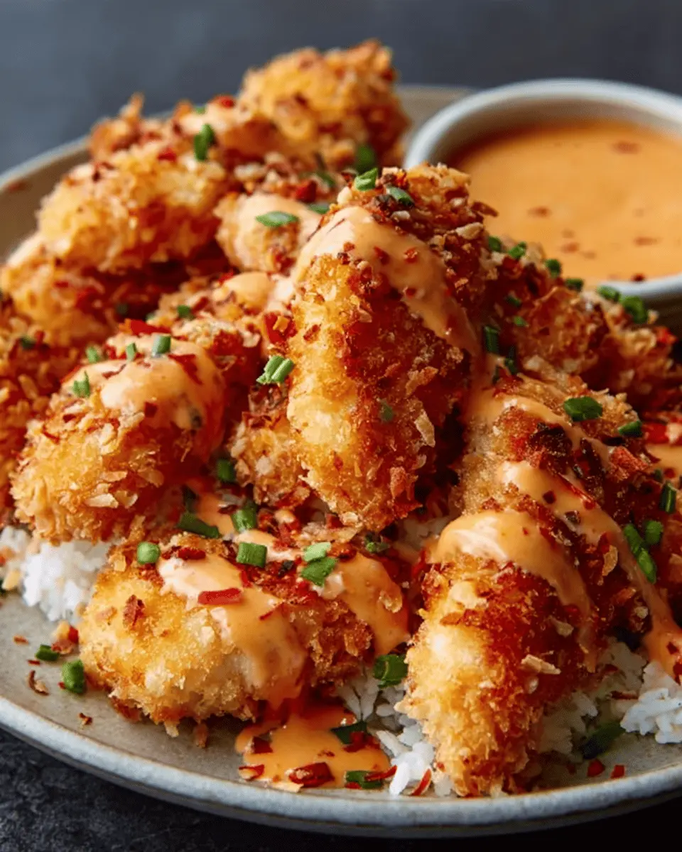 Enjoy this deliciously crispy coconut chicken paired with a flavorful Bang Bang sauce for a delightful meal.