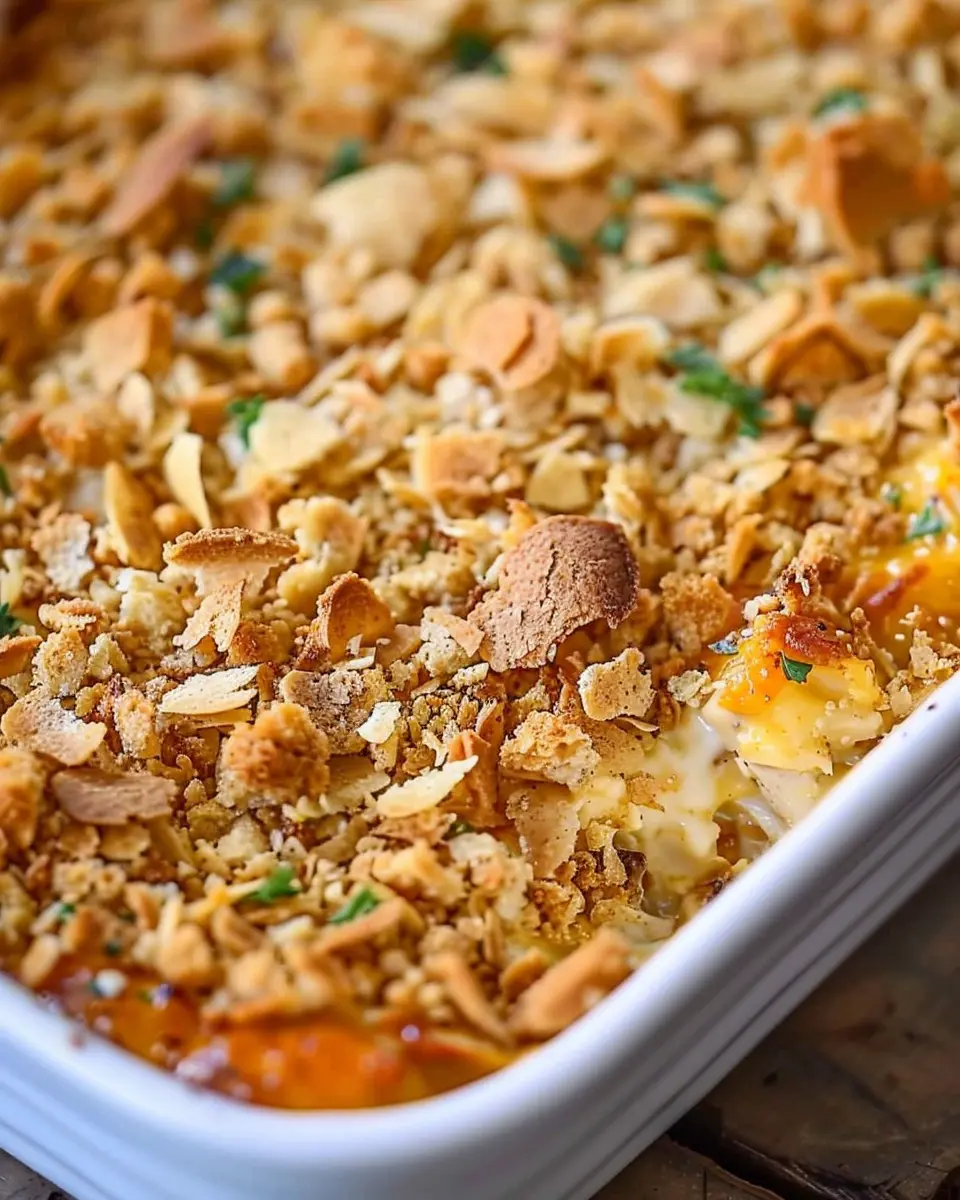 Now, who doesn’t love a good topping? In a separate bowl, melt the butter and then mix it with the crushed cornflakes. This crunchy layer is what elevates your million dollar chicken casserole! Toss in a sprinkle of shredded cheddar cheese for an extra cheesy topping.
