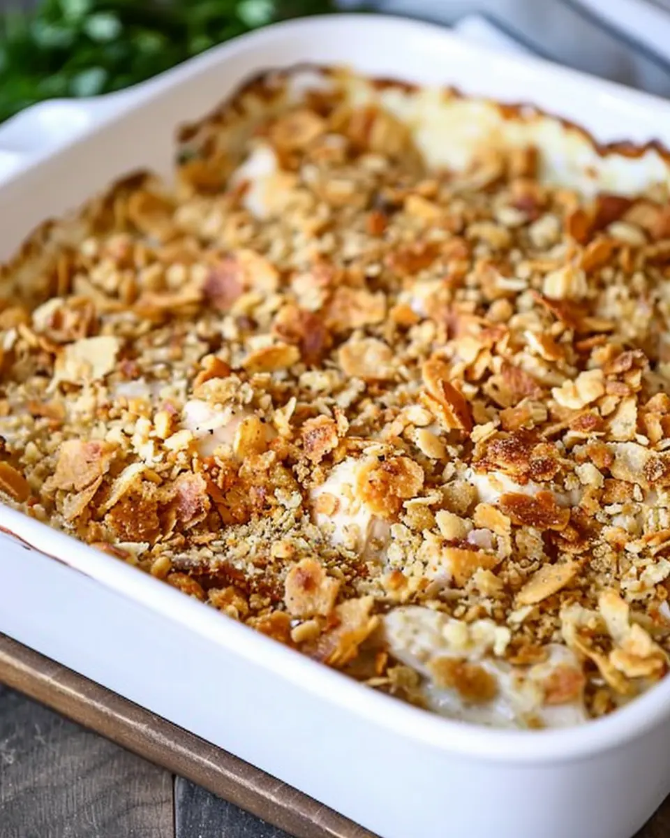 It’s finally time to assemble! Spread the creamy chicken mixture evenly into your greased baking dish. Then, sprinkle your buttery cornflake mixture on top—this will create that irresistible crust as it bakes.