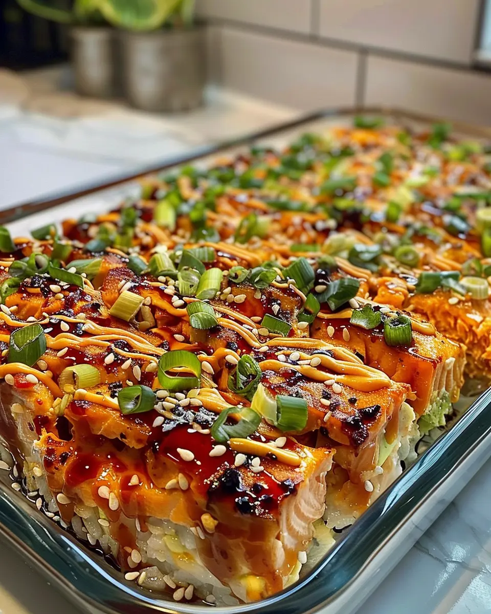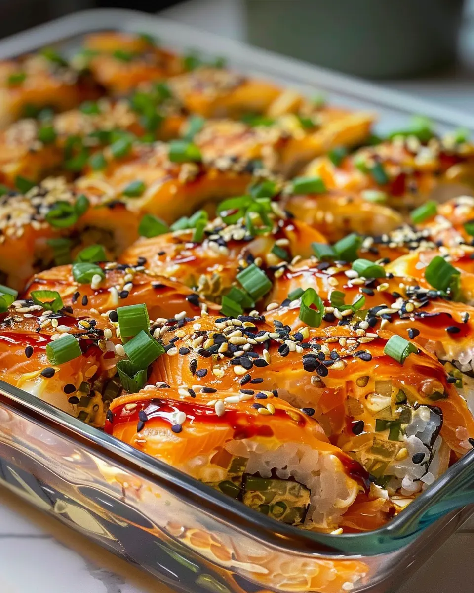 A delicious twist on sushi that combines the flavors of salmon in a comforting bake.