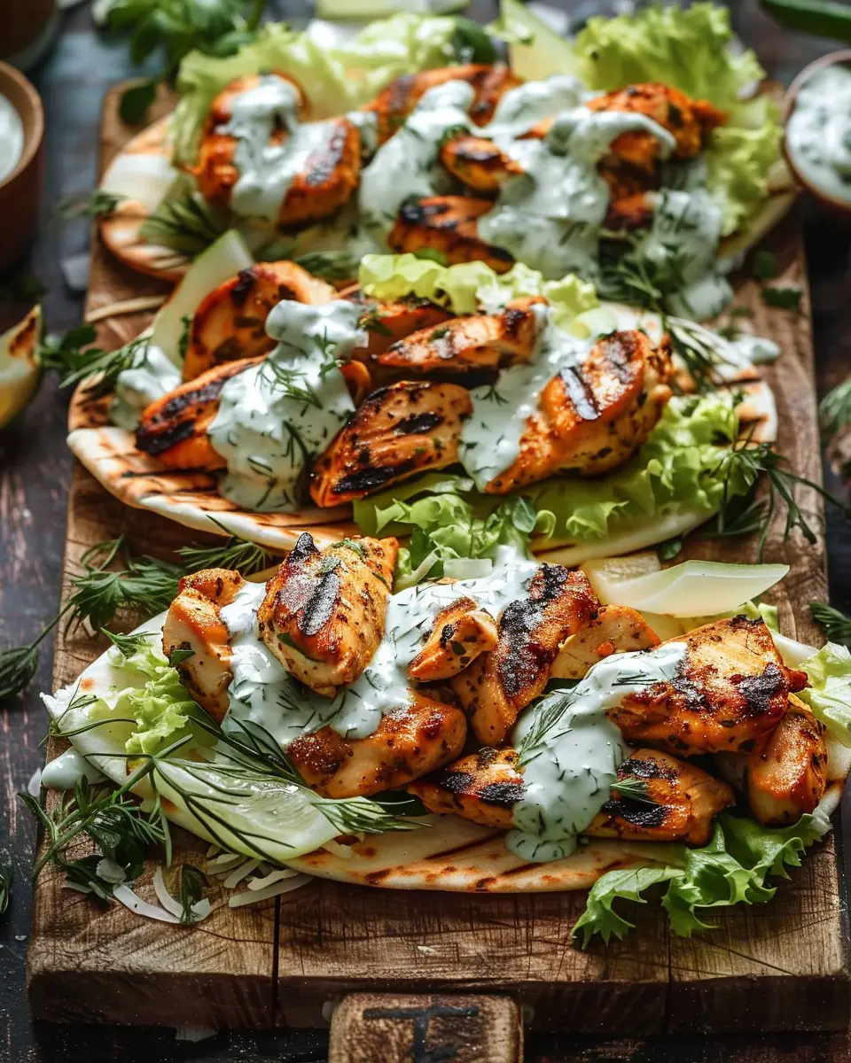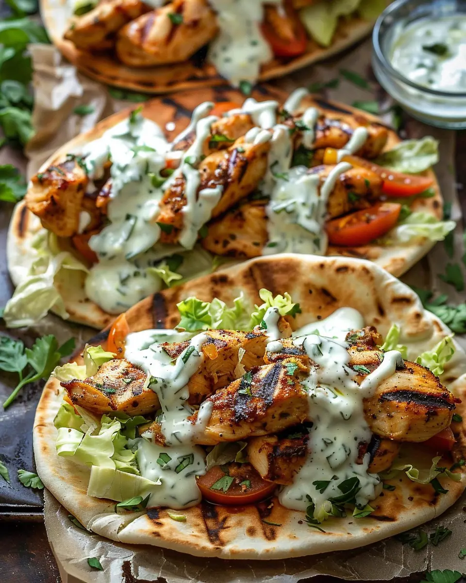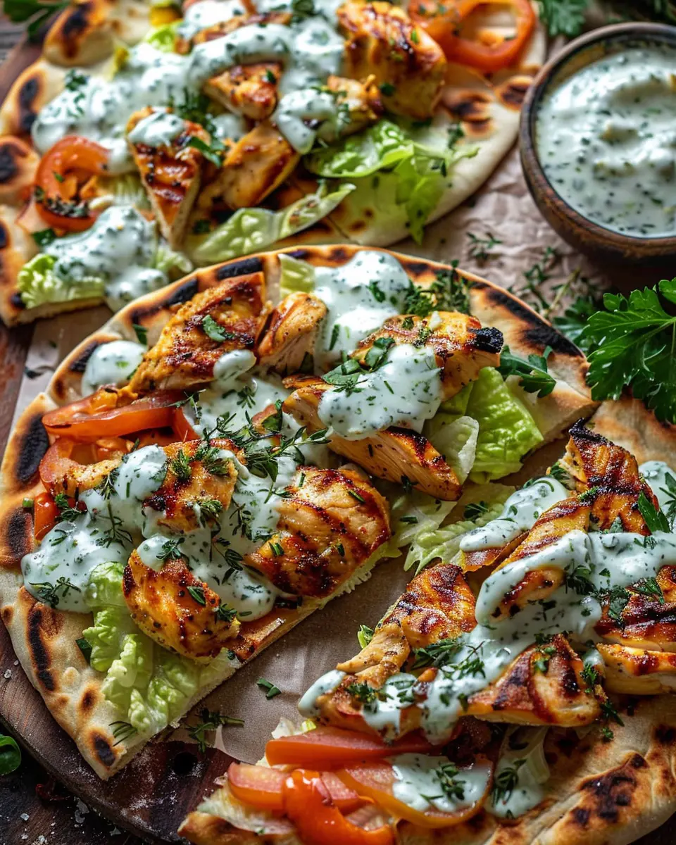 A quick and easy meal that combines juicy chicken with fresh veggies and a flavorful herby ranch sauce, all served in warm pita pockets.