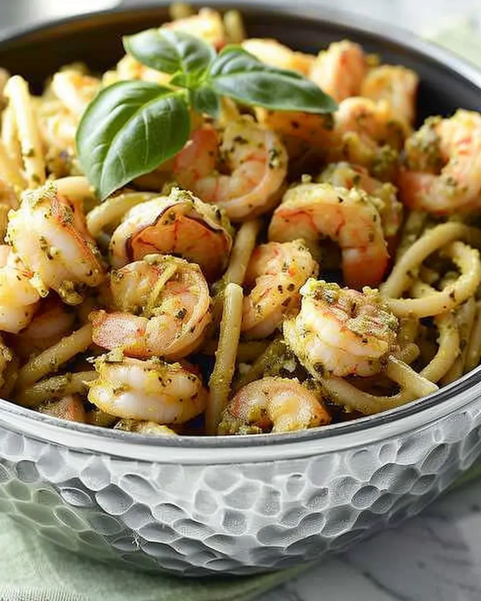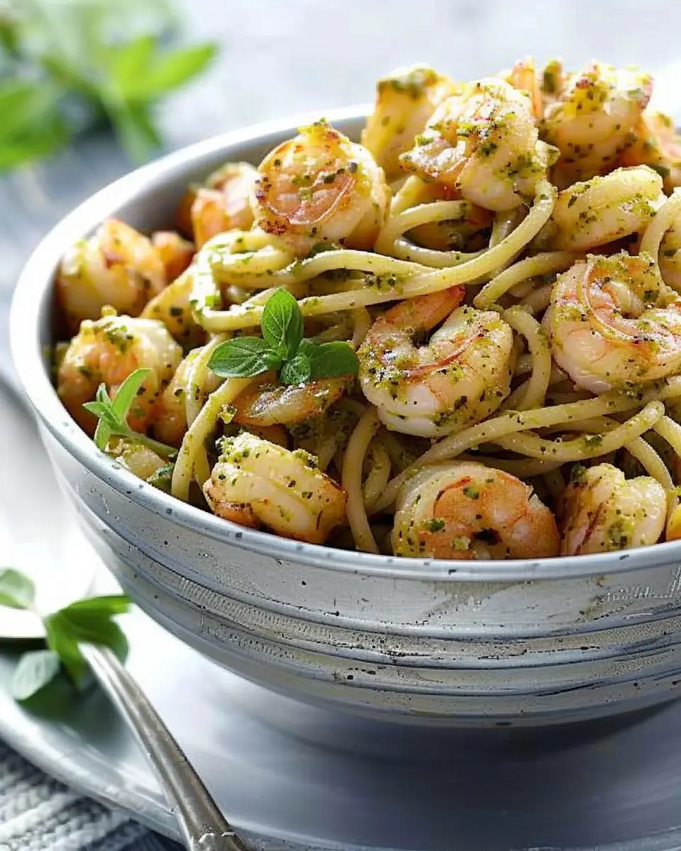 A quick and delicious shrimp pesto pasta dish that is easy to make at home.