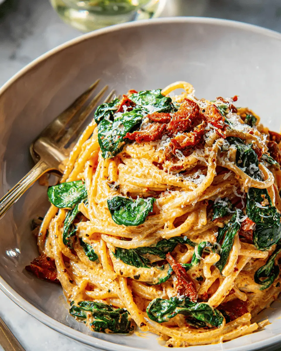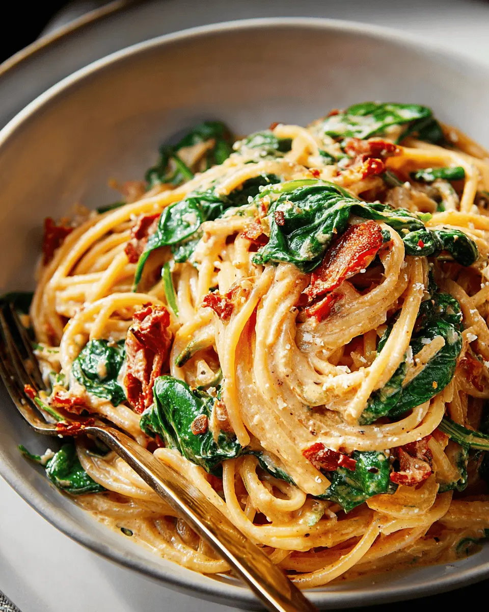 Delicious spaghetti topped with a creamy sun-dried tomato sauce and fresh spinach, perfect for a quick dinner.