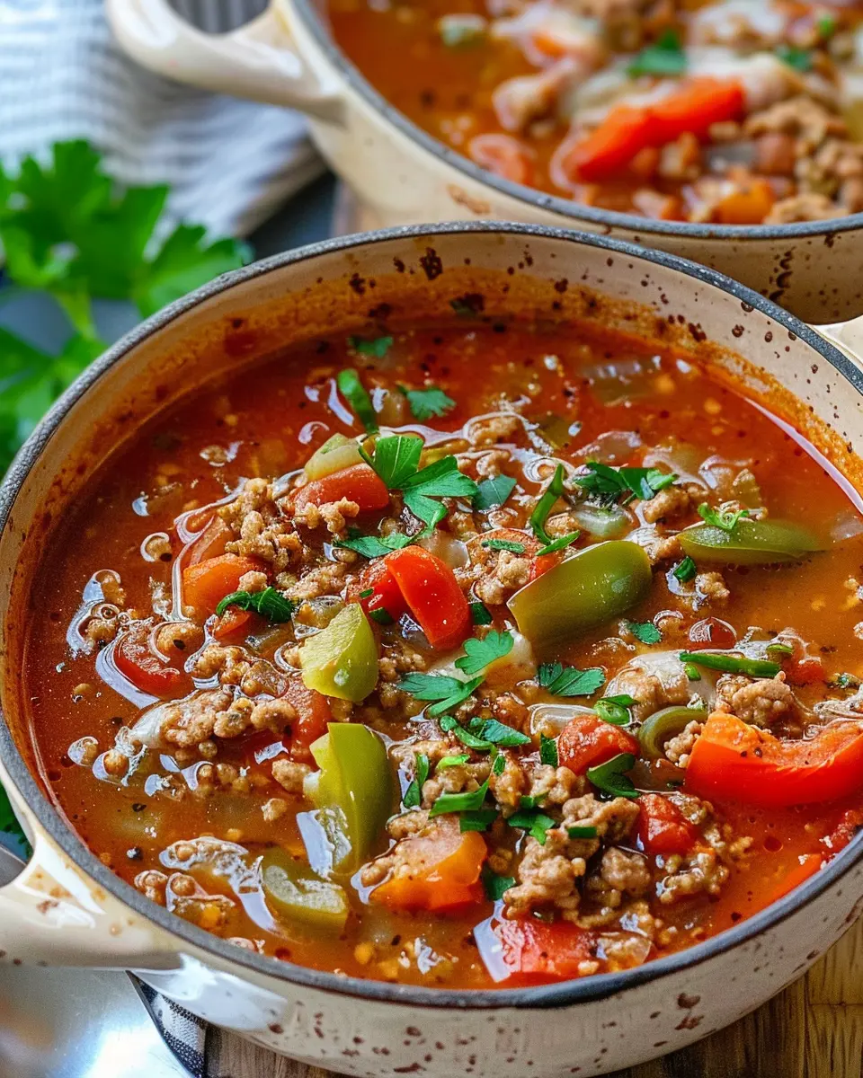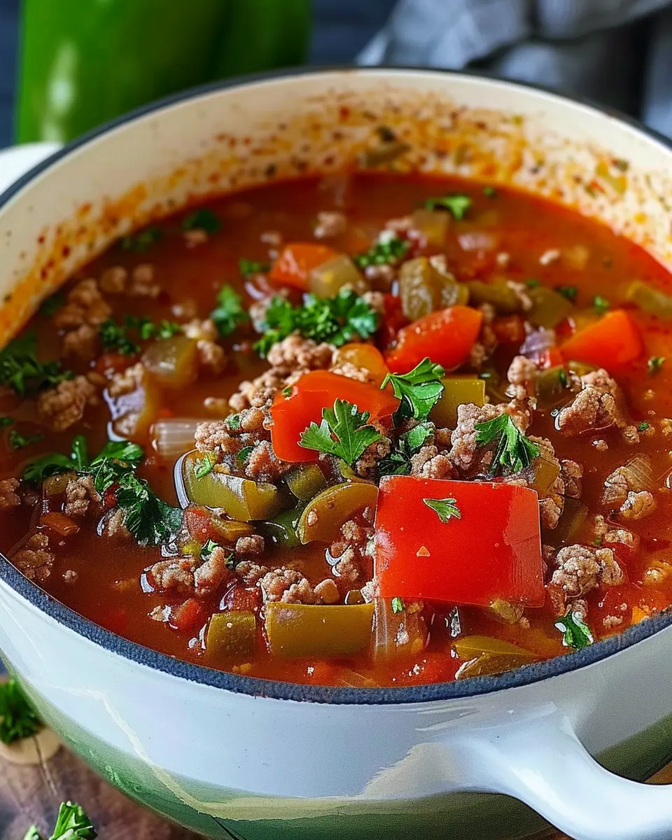 Once your soup is ready, it’s time to serve! Ladle the stuffed pepper soup into bowls. A sprinkle of fresh parsley adds a fabulous pop of color and freshness to the dish. If you’re feeling indulgent, add a sprinkle of cheese on top for extra flavor. Serve this delightful soup hot, paired with crusty bread or a simple garden salad for a wholesome meal.